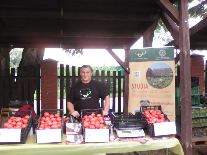 Zgromadziła ona bardzo liczne grono uczestników, którzy mogli obejrzeć sprzęty żniwne oraz tradycyjne obrzędy związane z corocznymi dożynkami. Ponadto były pokazy pracy dawnymi młocarniami, sposobów wiązania snopów czy zwózki zboża zaprzęgiem z udziałem wołów. Nie zabrakło też występów polskich i zagranicznych zespołów ludowych, jak również atrakcji dla najmłodszych. Festyn był okazją do promocji Wydziału Ogrodnictwa i Architektury Krajobrazu naszej Uczelni. Paweł Grabarczyk z Katedry Warzywnictwa, w koszulce z logo UP, miał na stoisku, obok owoców czterech odmian pomidora gruntowego, baner oraz ulotki z informacją o studiach i rekrutacji na WOAK.