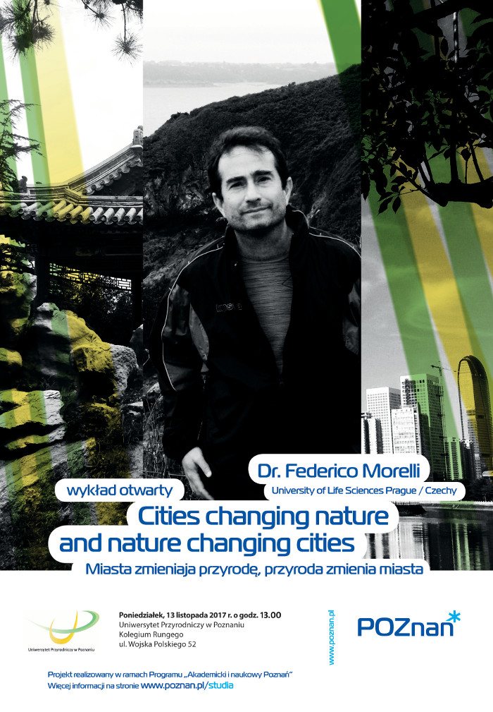 W dniu 13 listopada 20017 roku (poniedziałek) o godz. 13.00, na Uniwersytecie Przyrodniczym w Poznaniu (Kolegium Rungego ul. Wojska Polskiego 52), odbędzie się wykład otwarty dr. Federico Morelli pt: Miasta zmieniają przyrodę, przyroda zmienia miasta (Cities changing nature and nature changing cities).